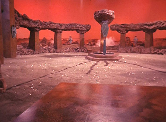 Y llegamos, por fin, al momento culminante de la acción. La ceremonia en cuestión es una especie de celebración matrimonial, ya que la tradición vulcana hace que las parejas se comprometan cuando son niños por decisión de sus familias. El acto se celebra en un templo situado en tierras de la familia de Spock (su aspecto nos recuerda los círculos de piedras de las islas Británicas, como Stonehenge, pero de tamaño mucho más modesto). El rito es oficiado por T’Pau, una respetada anciana de Vulcano, influyente persona que puede permitirse el lujo de rechazar un asiento en el consejo de la Federación.