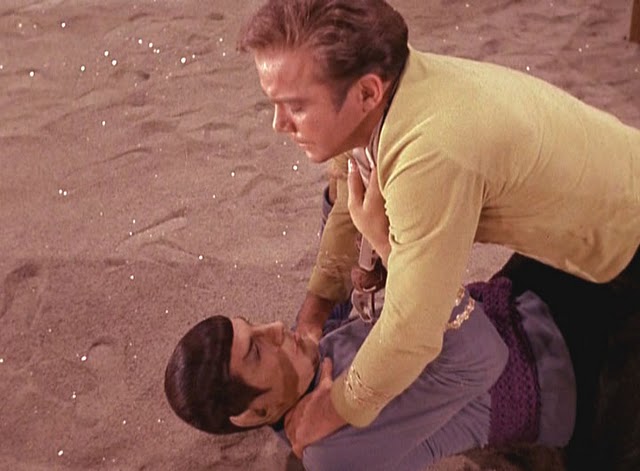 Esto deja tan asombrado a Kirk como al espectador. Todas las teorías sobre la lógica vulcana, sobre el control de las emociones, se vienen abajo ante la evidencia de que, a la hora de la verdad, también ellos están sometidos a la tiranía del sexo, y además de una manera bastante más salvaje que los humanos. Pero el Capitán reacciona enseguida de la única manera que podía esperarse: intenta conseguir el permiso para dirigirse a Vulcano antes de cumplir con su misión diplomática. Como no lo consigue, actúa como en el es habitual, tira por la calle de en medio y, sin encomendarse a nadie, hace que la nave se dirija de inmediato al planeta de Spock, saltándose a la torera el reglamento y todo lo que haga falta.