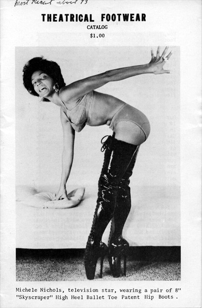 Nichelle Nichols, estrella de televisión, en esta imagen lleva unas botas  muy espectaculares con un tacón alzado que toca el cielo. Catálogo teatral de calzado.. publicidad a 1 dólar.