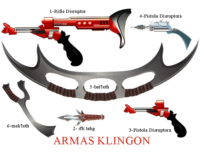 En su larga experiencia en contacto y a menudo en contraste, con otras civilizaciones, la Flota Estelar ha tenido que enfrentarse contras las armas más diversas, dese el fáser común, conocido por doquier, hasta las armas blancas, aún más empleadas, por ejemplo, entre los klingon. En el territorio de este guerrero pueblo, el desarrollo paralelo de las armas blancas merece una atención especial.
