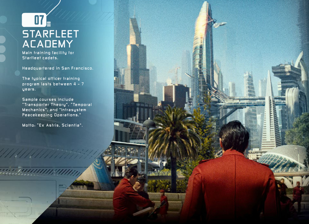 El campus principal de la Academia se encuentra en San Francisco, Tierra, aunque hay numerosos establecimientos en otros mundos de la Federación de Planetas Unidos.