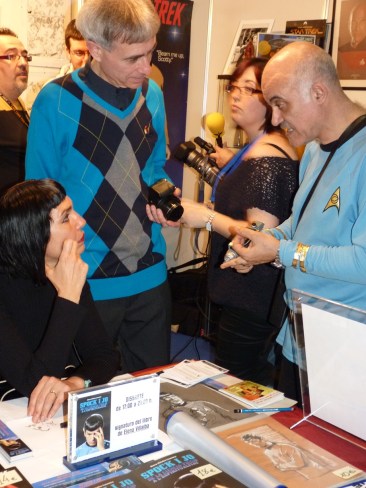 Elena Villalba (presidenta del Spockies Club) con Joan Bosch (Vicepresidente del Spockies club y miembro de «Elena i Joan Projects») y Julián Sánchez (Presidente del CSTE, Club Star Trek de España) en el Ficomic-2012, 30º Salón del Comic de Barcelona, 05-05-2012.