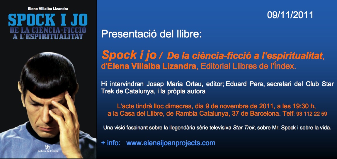 «Hola, amics! És per a mi un plaer haver estat convidada en aquest blog per presentar-vos el meu llibre Spock i jo. De la ciència-ficció a l’espiritualitat, Llibres de l’Índex (novembre-2011). A la contracoberta, apareix la següent frase: “És una experiència viva, una visió fascinant sobre la llegendària sèrie televisiva Star Trek, sobre Mr. Spock i sobre la vida”. I és que quan vaig comprar els devedés d’aquesta obra de culte, vaig reviure la sèrie de tal manera que escriure aquest llibre va ser una necessitat, és pur entusiasme.