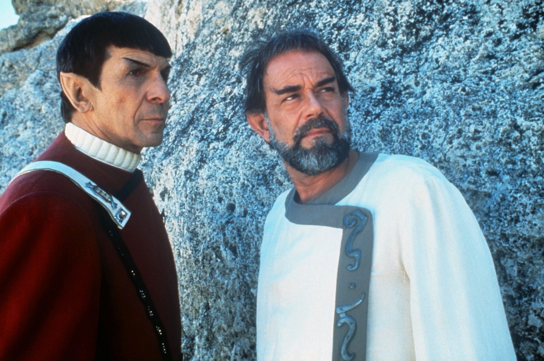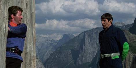 Las primeras imágenes del film hacen pensar en un extraño cruce entre el desierto de arena de El Retorno del Jedi y el Mad Max de George Miller. Después de un diálogo místico entre dos extraños personajes, campesino el uno, lúgubre encapuchado el otro, vemos a Kirk (un doble de Shatner perfectamente identificable) escalando El Capitán, uno de los picos más altos del parque de Yosemite.