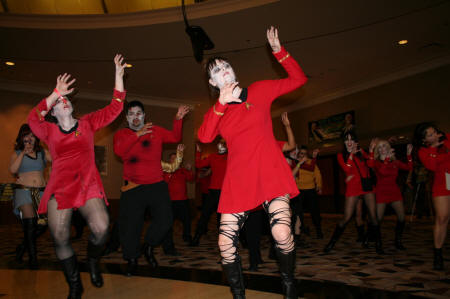 La convención de Star Trek 2012 en Las Vegas arrancó el pasado agosto con un grupo de camisas zombificados con la camiseta roja de la tripulación de Star Trek bailando el tema Thriller de Michael Jackson.