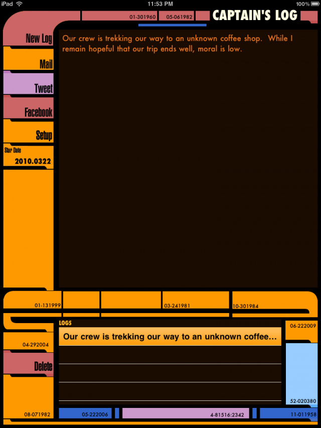 Desde luego si algún desarrollador de la App Store es lo suficientemente fan de Star Trek podría convertir el iPad en el iPADD. En realidad se trata de un skin, muy bien hecho, por cierto, para diferentes redes sociales, se llama Captain’s Log, aunque no se ha encontrado una página web o similar donde se pueda ver sus planes de futuro para hacerle un seguimiento al skin más trekkie de la galaxia.