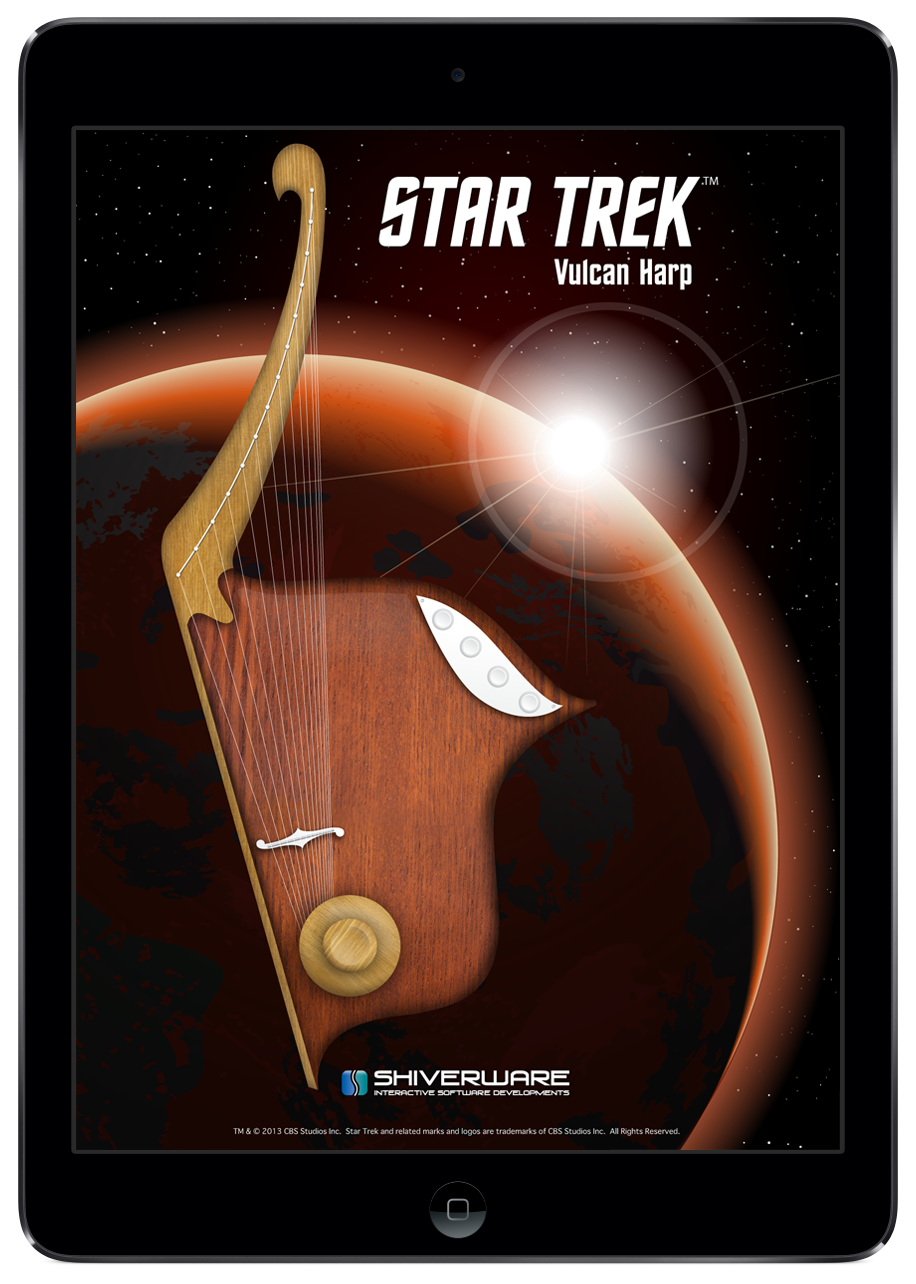 Ahora es tu oportunidad, Shiverware y CBS Interactive se han unido para presentar la aplicación Star Trek Vulcan Harp para iPad. Disponible ahora en la App Store de Apple, es una réplica del arpa de Spock que cuenta con una rica y detallada taracea y movimiento de fondo de campo estelar, así como 15 cuerdas vibrantes (cada una identificada para hacer que la canción-que se toque sea fácil), 5 sonidos de instrumentos (saltando de futurista a arpa clásica). Además, hay controles personalizados para la distorsión multi-nivel y la reverberación, un botón de fondo para acordes de secuencia y la capacidad de elegir la escala pentatónica (de cinco notas por octava).