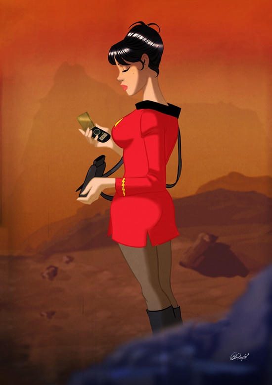 Esta claro que le encanta la serie clásica. Creció con ella y este es su homenaje. Le propusieron hacer unos dibujos de chicas de Star Trek y no se lo pensó. Incluso sería una buen pretexto para hacer un comic de Star Trek.