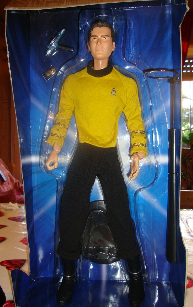 Figura del Capitán James Tiberius Kirk, de 50 cm. con el uniforme de tela, y apretando en el torax con la voz original de William Shatner en inglés dice: «Soy el Capitán Kirk de la nave Enterprise»