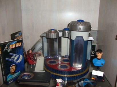 Detrás del todo un phaser de la serie de tv Star Trek Enterprise y un comunicador de la misma serie. Delante un busto pequeño de Spock, un comunicador, un destapador de botellas con forma del Enterprise, chapas con logotipos trek, y el teletransportador de Star Trek 2009, con Scotty al mando y Spock teletransportandose