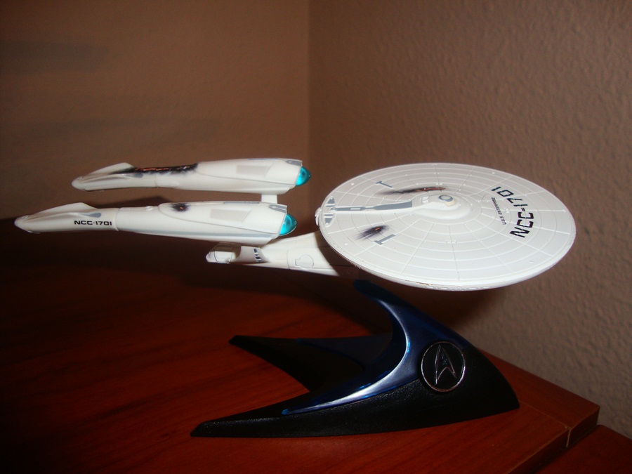 Enterprise NCC-1701 de la última película Star Trek 2009, que reune el diseño de las Enterprise de la Serie Original y Star Trek La Película de 1979.  Este modelo tiene dañada algunas partes,  después de una batalla.